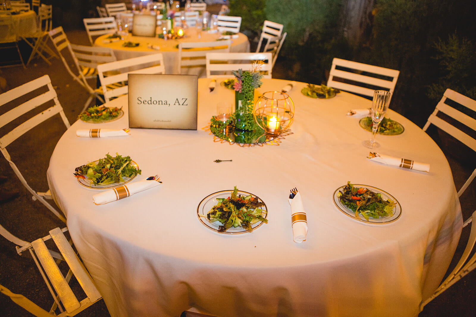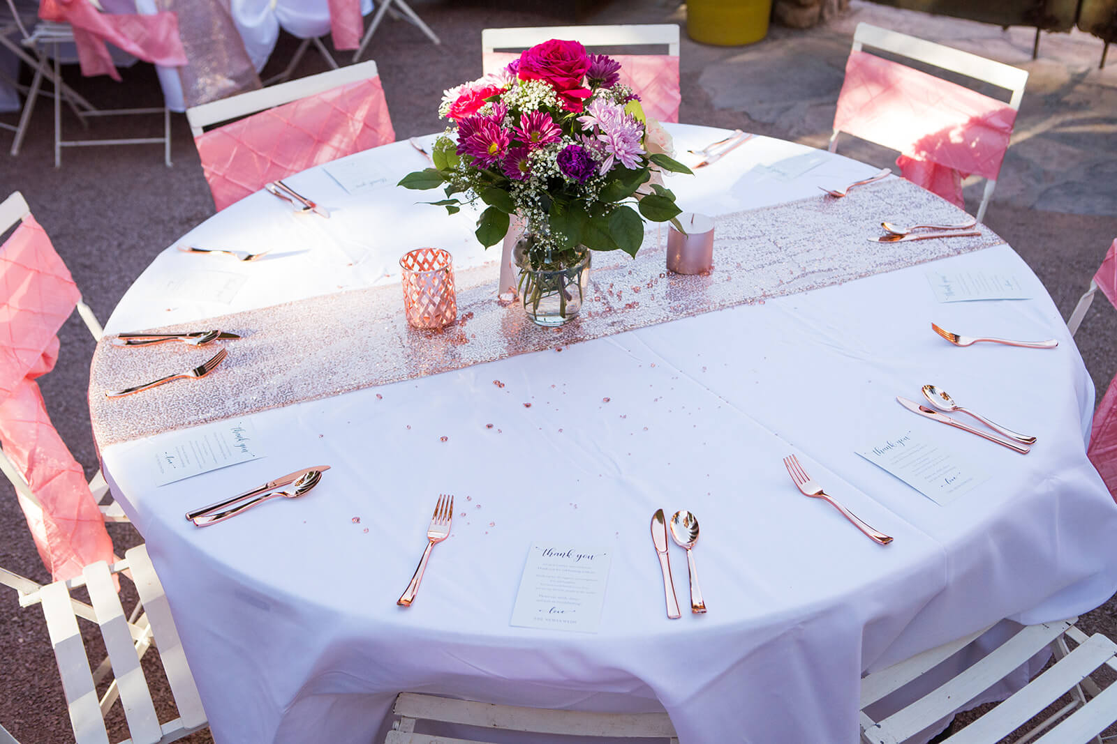The ceremony starts with rows of chairs only, then everything is transformed into dinner seating with tables. This takes more time and direction, since someone needs to guide the layout and decorations.
